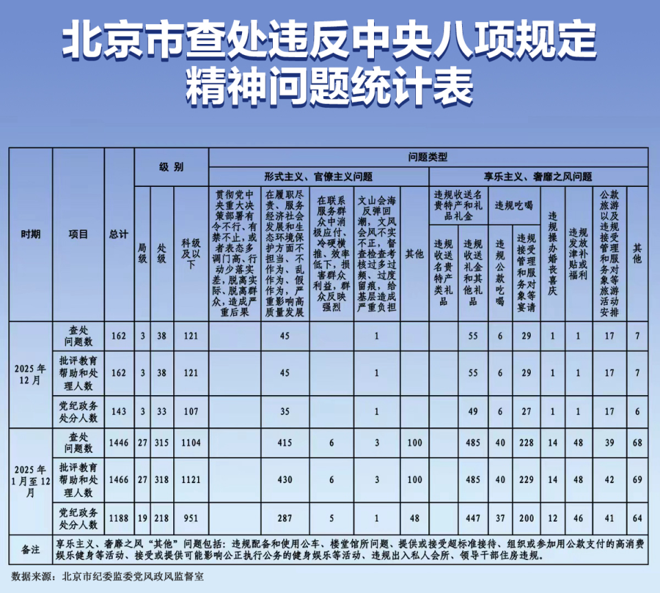 日前,北京市纪委监委公布了2025年12月查处违背中央八项划定精神问题汇总情况。当月,全市查处违背中央八项划定精神问题162起,月旦解释匡助和处理162东说念主,其中党纪政务贬责143东说念主。
