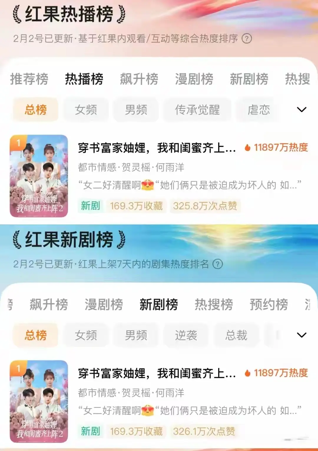 俩东谈主相助的《穿书巨室妯娌,我和闺蜜都上阵2》一上线就热度狂飙,不仅播放量平凡破亿,还一举拿下红果热播榜、新剧榜、热搜榜三榜第一!演技颜值不输曾辉韩雨彤!