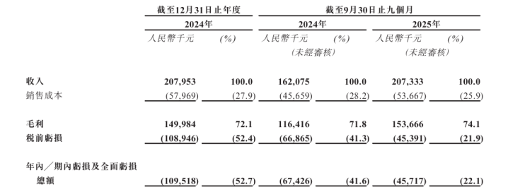 招股书浮现的财务数据袒露,2024年、2024年及2025年前9个月,公司的收入分裂为2.07亿元、1.62亿元及2.07亿元,毛利分裂为1.49亿元、1.16亿元和1.53亿元。